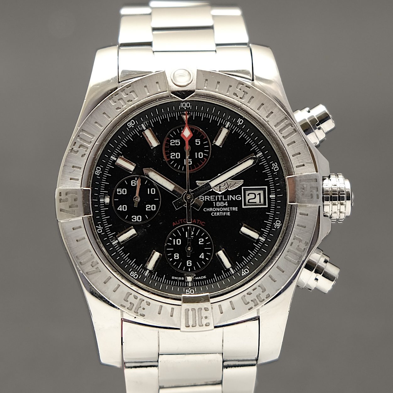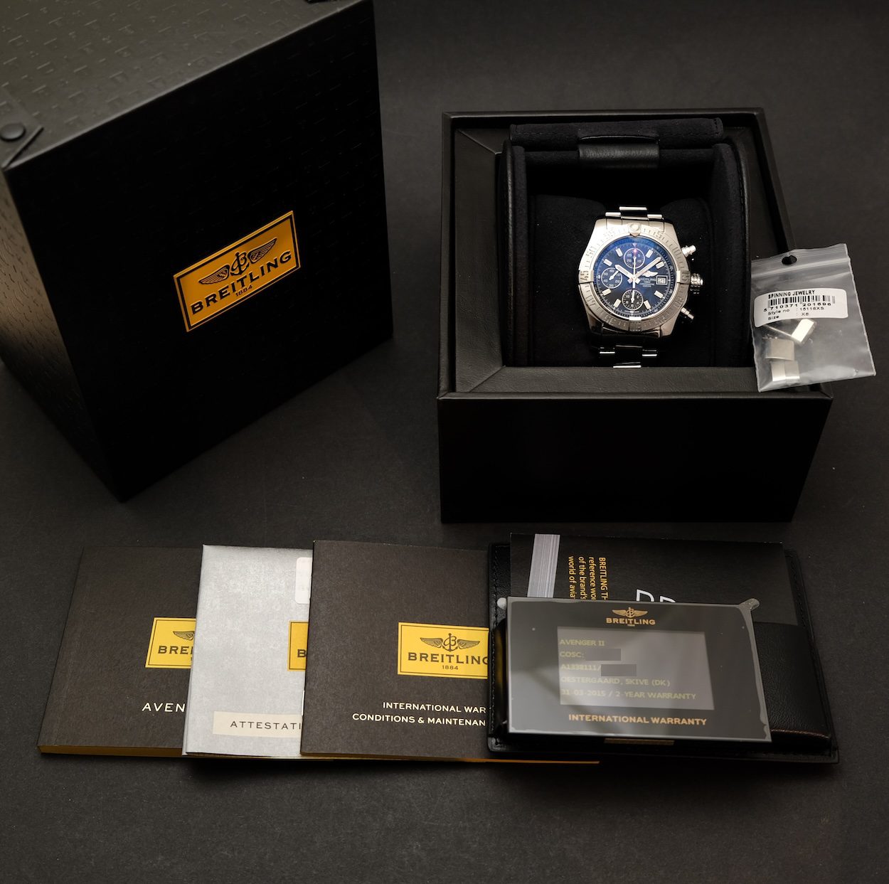 Breitling Avenger II ref A1338111 fra 2015. Kommer med bokse og papirer fra Østergaard. Fremstår i pæn stand hele vejen rundt med alm. brugsspor. Uret måler 43 mm med sort skive og Breitlings velkendte B01 in-house værk. Klassisk Breitling som har den helt rette størrelse og design.