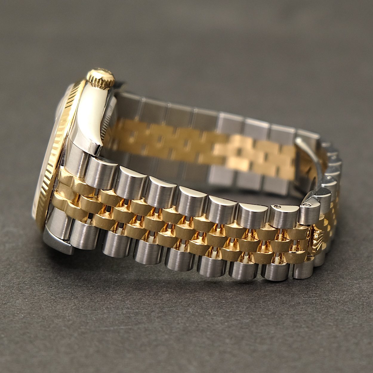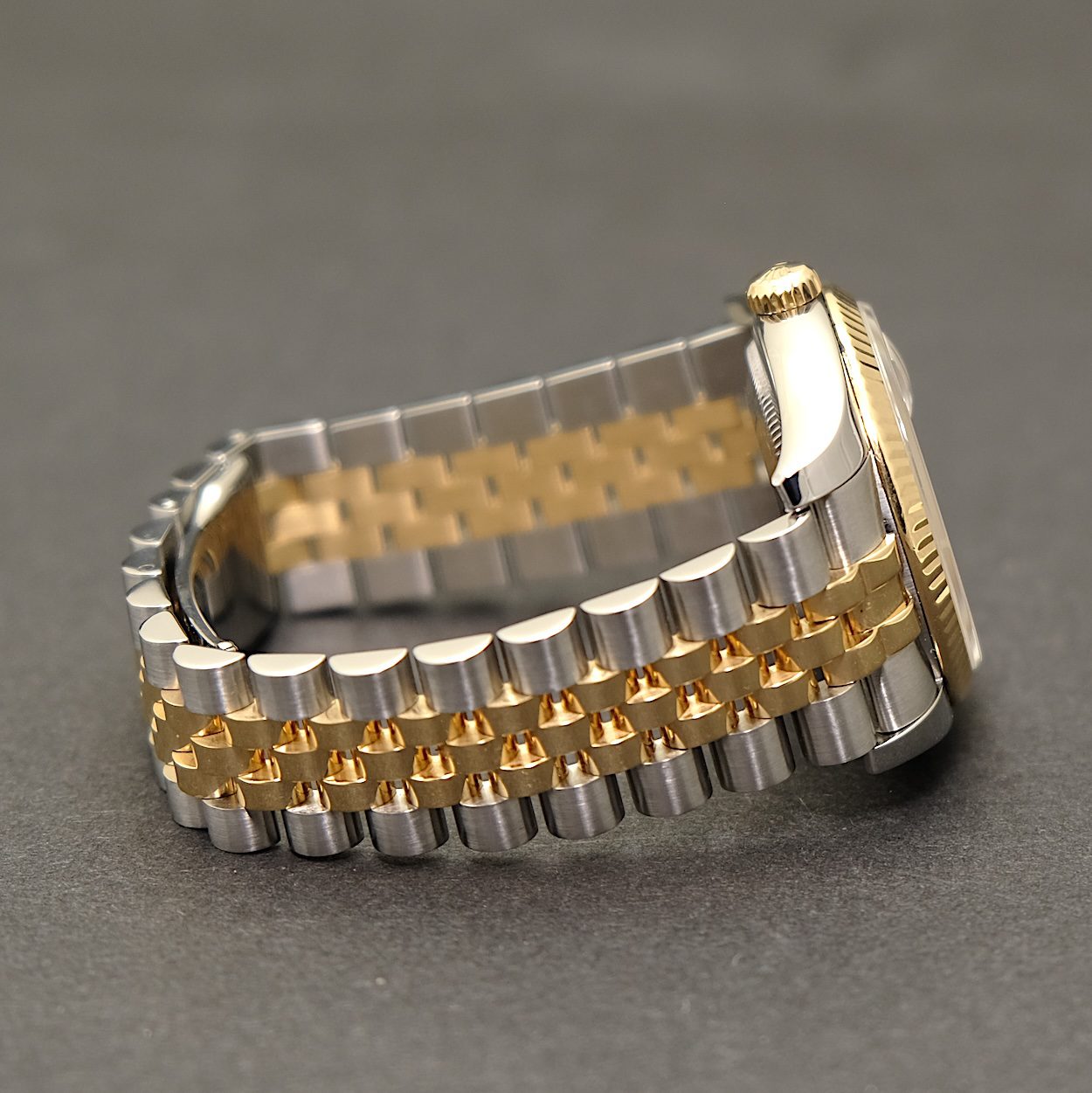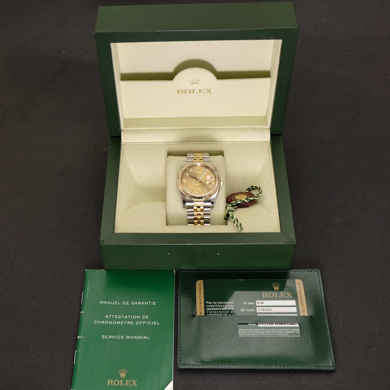 Rolex Datejust 116233 med bokse og papirer fra 2007. Det klassiske Datejust i 36 mm som her kommer med den flotte Champagne diamant skive, 18 k riflet guldlynette, og den eftertragtede massive superjubilee lænke (med skjult lås), som nu er udgået. Ur og lænke fremstår i rigtig fin stand uden nævneværdige brugsspor ud over minimale hairlines.