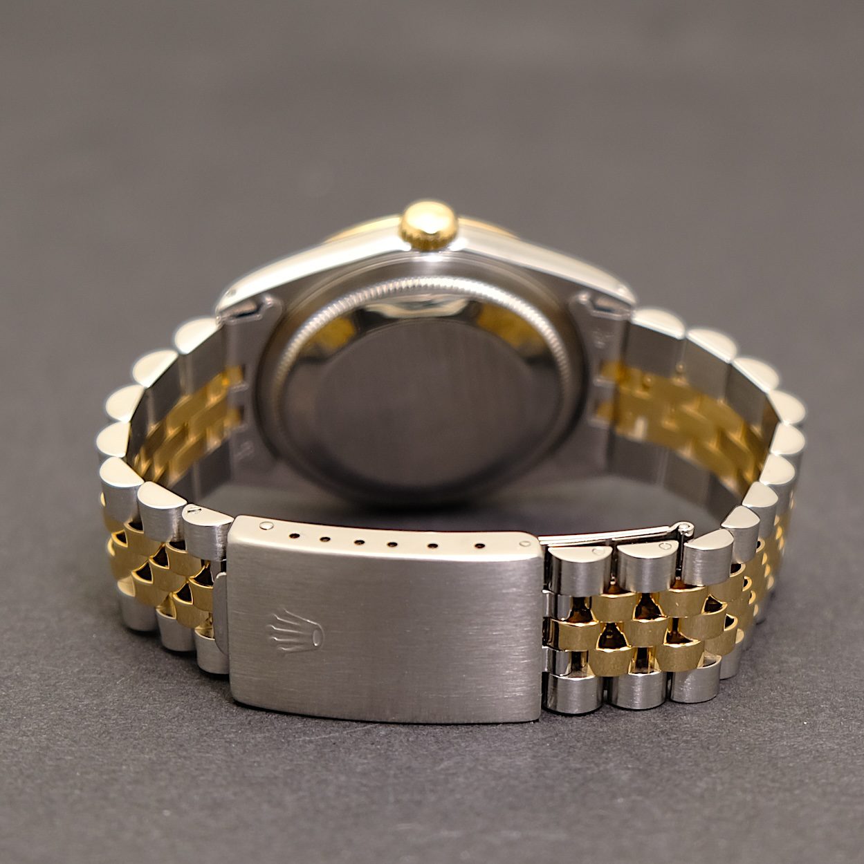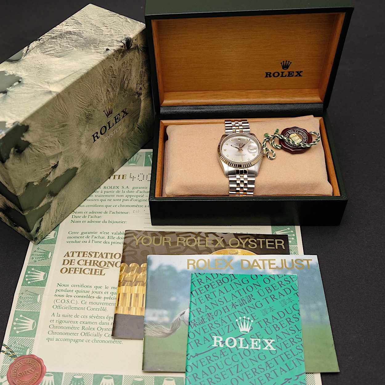 Rolex Datejust 16233 med bokse og papirer fra 1989. Det klassiske Datejust i 36 mm som her kommer med sølv diamant skive, 18 k riflet guldlynette, og Jubilee lænke. Ur og lænke fremstår i rigtig fin stand uden nævneværdige brugsspor ud over minimale hairlines.