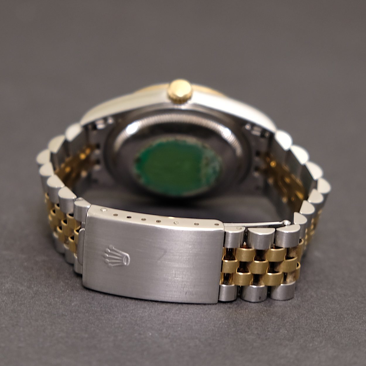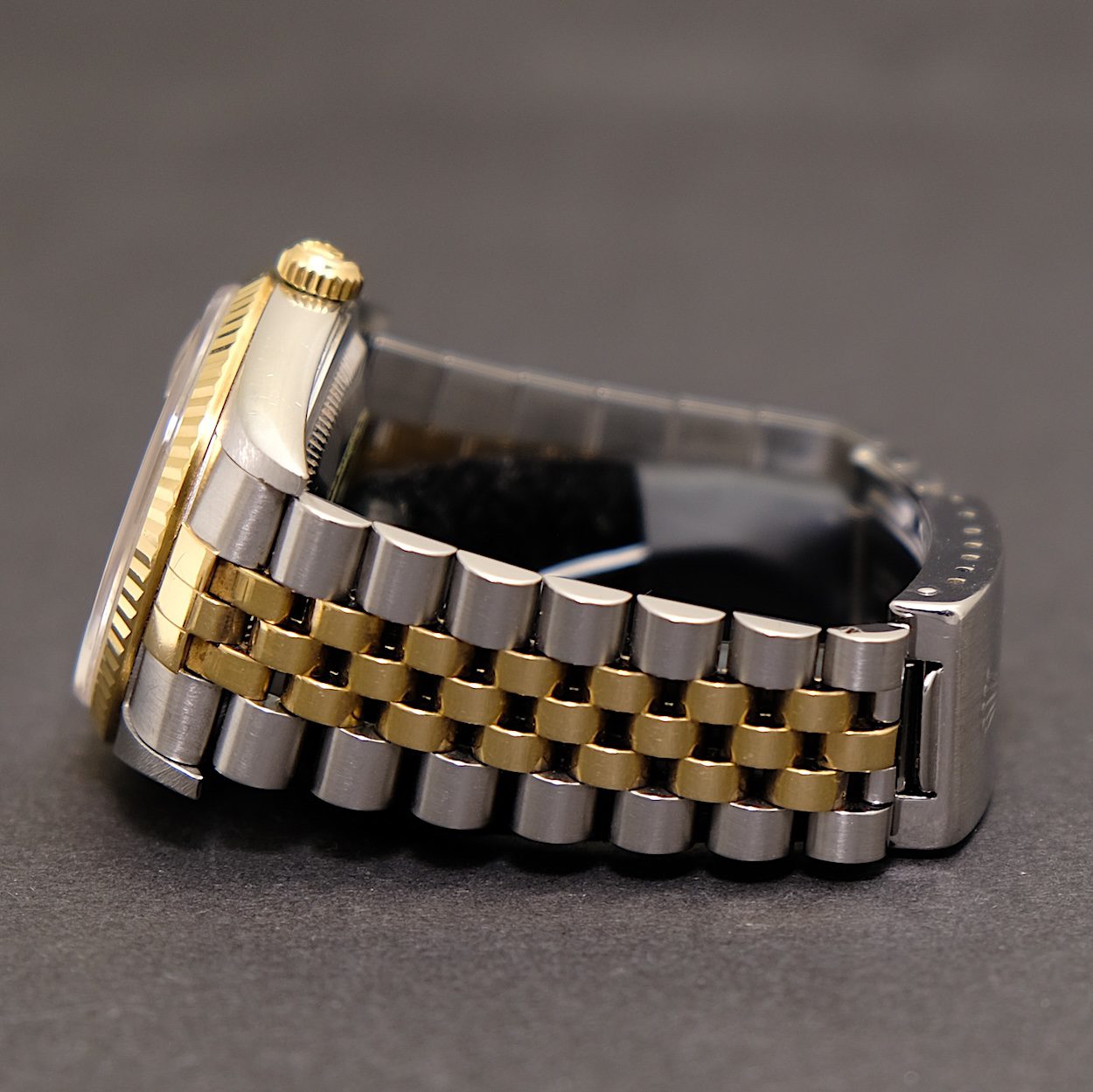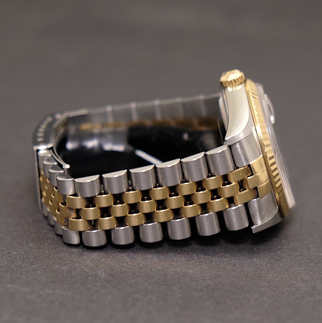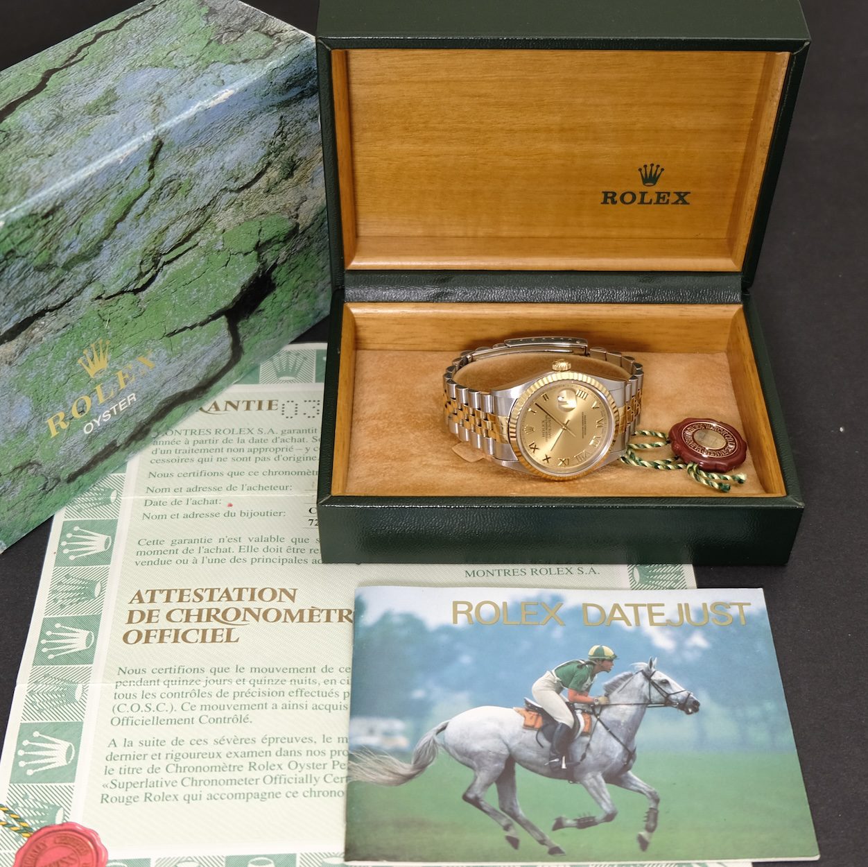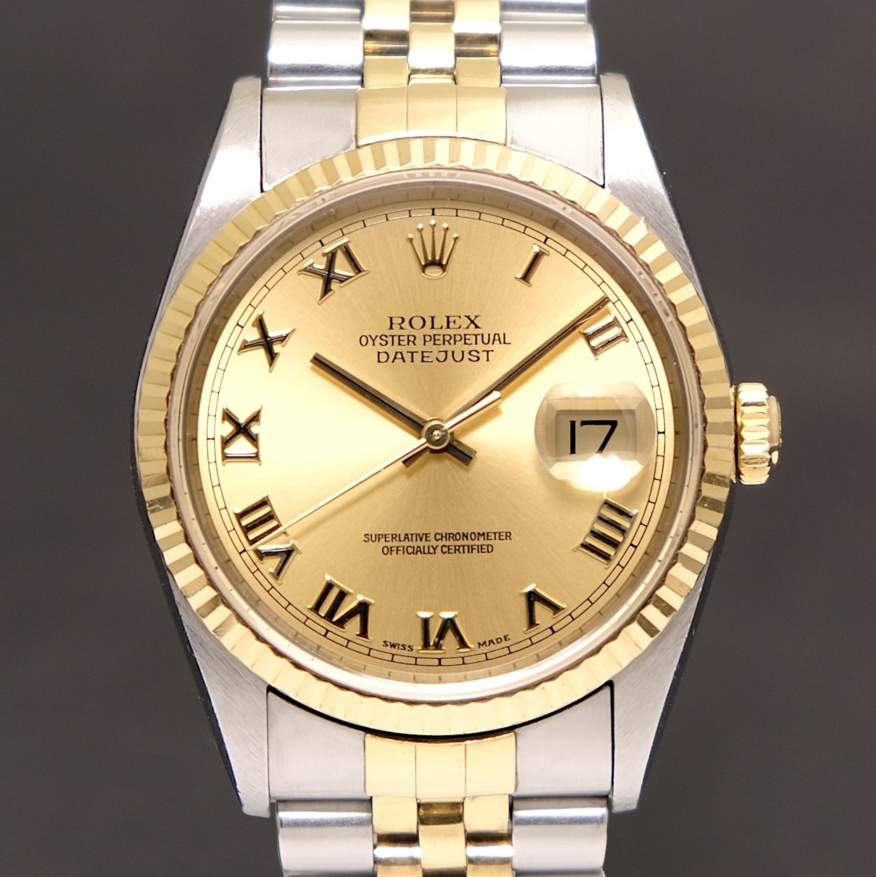 Rolex Datejust 16233 fra 2001 med bokse og papirer. Det klassiske Datejust i 36 mm, som her kommer med Champagne skive og Jubilee lænke. Fremstår i pæn stand med alm. aldersrelaterede brugsspor. Et ur der både går til damer og herrer pga. den klassiske 36 mm størrelse. Den nyere reference 16233, som er opdateret ift. værk og safirglas.
