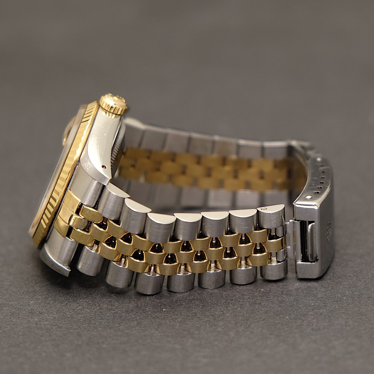 Rolex Datejust 16233 med bokse og papirer fra 1990. Det klassiske Datejust i 36 mm, som her kommer med Champagne skive, 18 k riflet guldlynette, og Jubilee lænke. Ur og lænke fremstår i rigtig pæn stand med alm. små brugsspor. Lænken i tilsvarende pæn stand uden bemærkelsesværdig stræk.