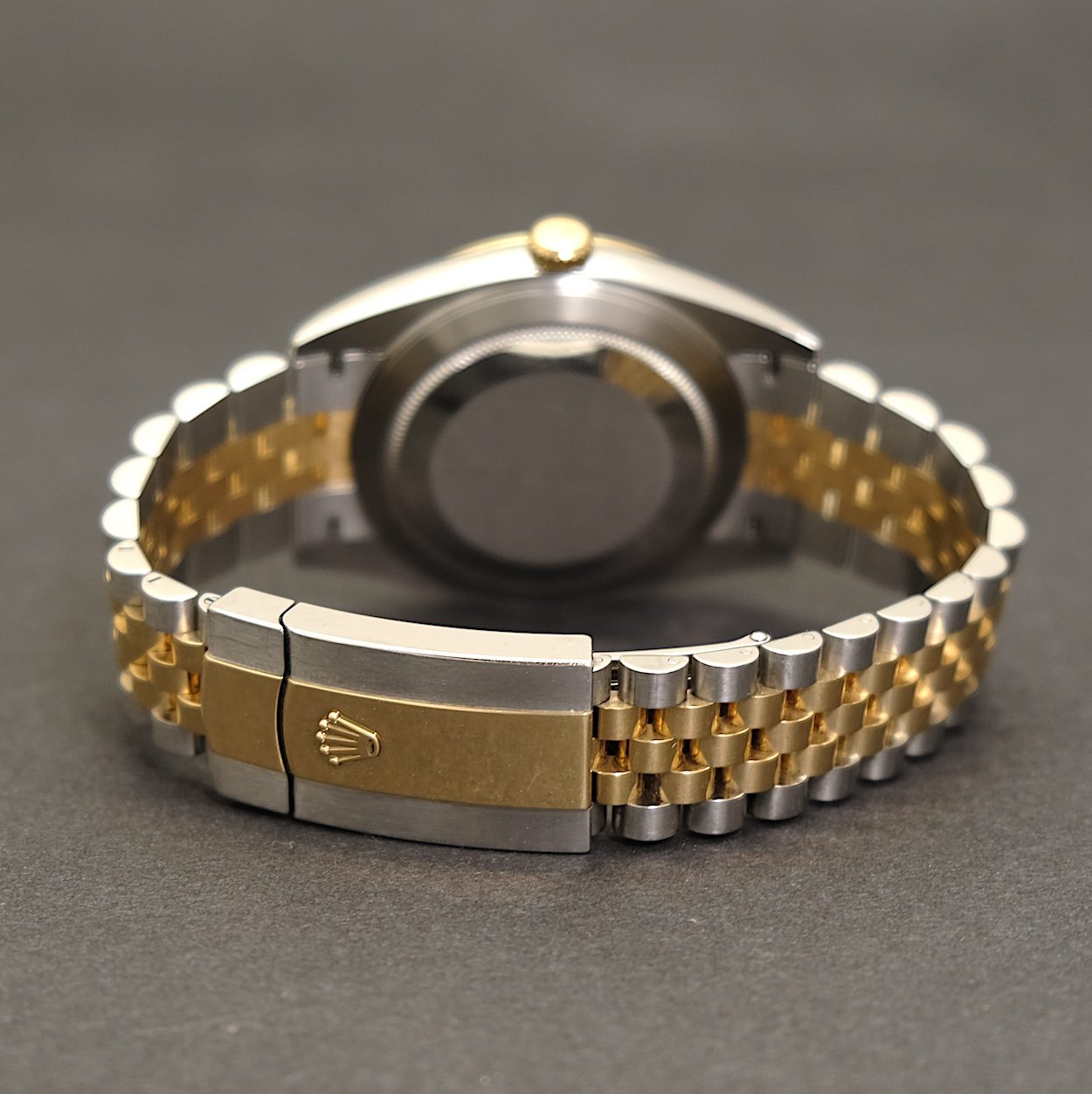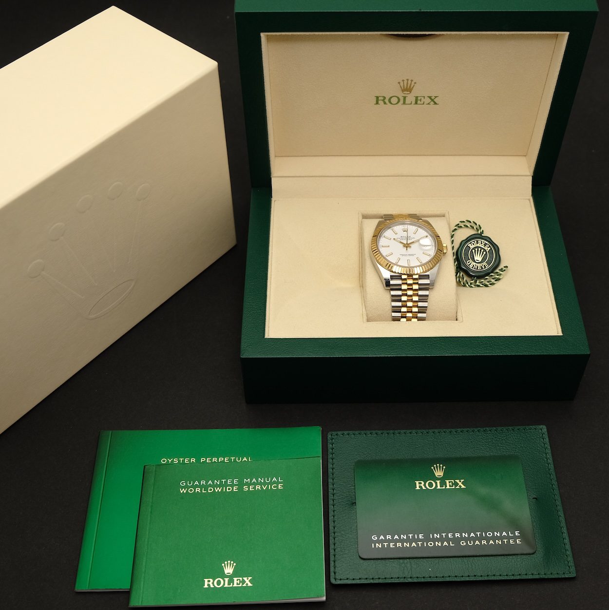 Rolex Datejust 126333 fra 2022 med Klarlund bokse og papirer. Yderligere kopi af orig. kvittering medfølger. Fremstår i pæn stand med alm. brugsspor. Modellen i 41 mm i guld/stål med hvid skive og Jubileelænke. Et af de få herremodeller som kan købes til pænt under listepris som er 125.000 DKK.