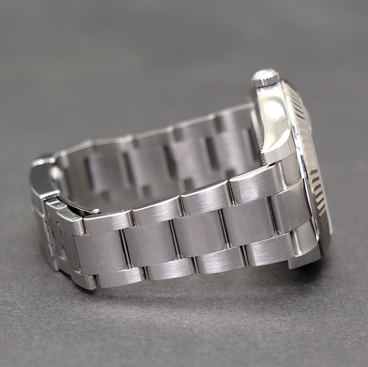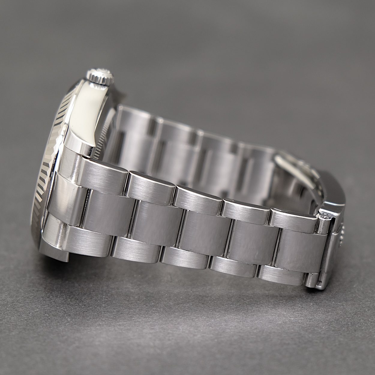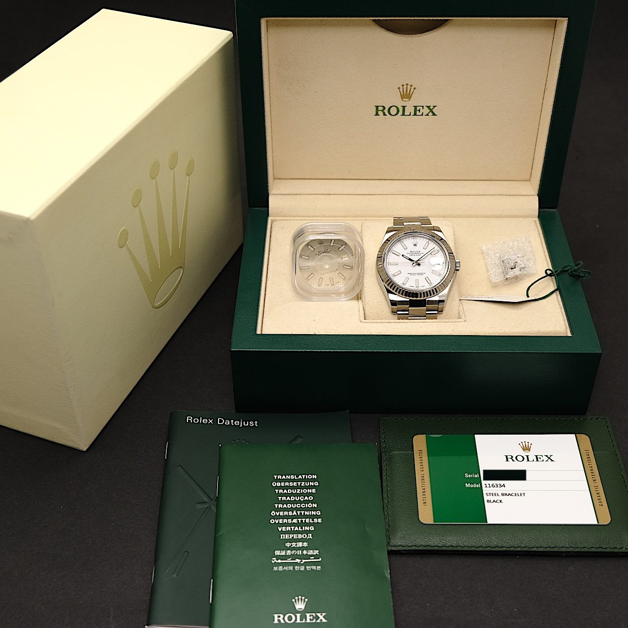 Rolex Datejust II ref 116334 med bokse og papirer fra 2016. Fremstår i flot stand med små overfladiske brugsspor. Modellen måler 41 mm model og kommer på Oyster-lænke. Uret kom oprindeligt med sort skive, men denne er ombyttet til hvid hos Knud Pedersen (inkl. kvittering på dette). Desuden medfølger en sunburst silver skive til uret, så man kan skifte udtryk.