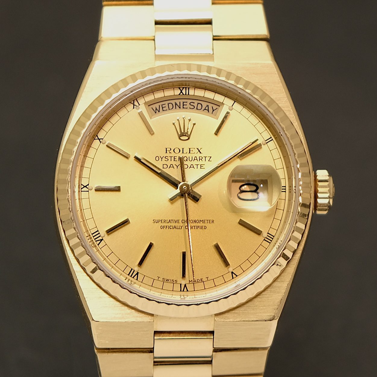Et specielt Day-Date der adskiller sig fra de andre ved det præcise Oysterquartz værk. Oysterquartz modellen blev kun lavet i perioden midt 70’erne til start 80’erne. I Day-Date udgaven er uret ekstremt sjældent ift. de stk. tal vi ofte ser Rolex produceret i.