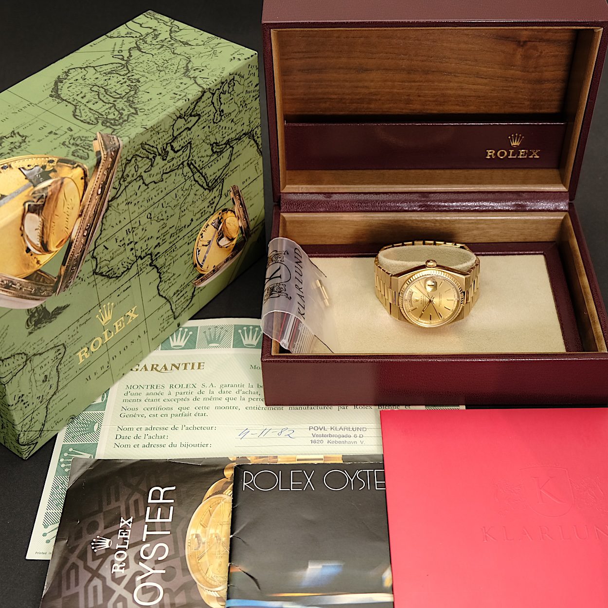 Rolex Day-date Oysterquartz ref 19018 i 18 k guld fra 1982 med bokse og Klarlund papirer. Desuden kvittering fra Klarlund pre-loved fra 2023. Den flotte Oysterquartz i 36 mm udgave med champagne skive. Et kasse-design med mange ligheder til det netop lancerede Land-Dweller. Lænke i flot stand uden stræk. Alt i alt et sæt i samler-stand.