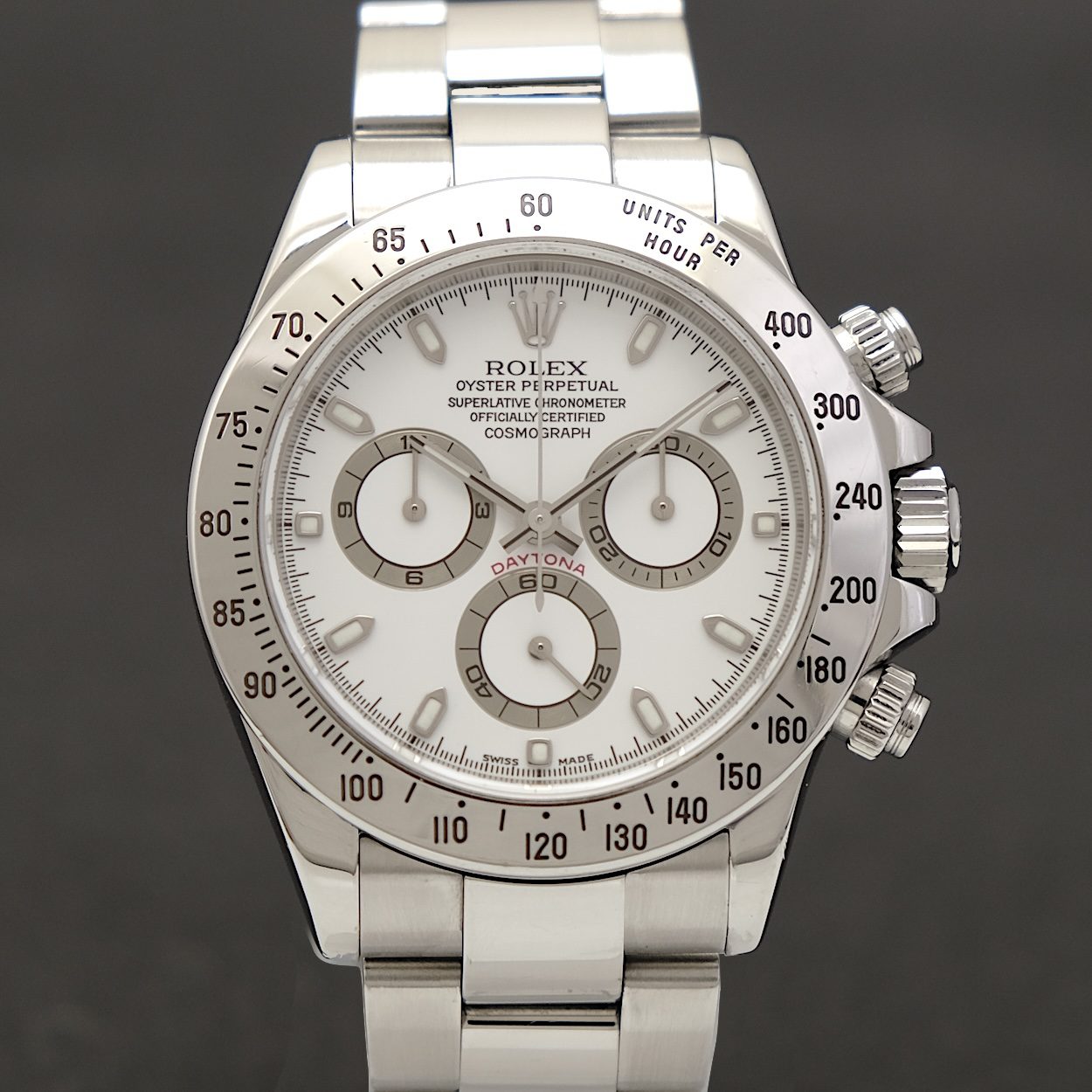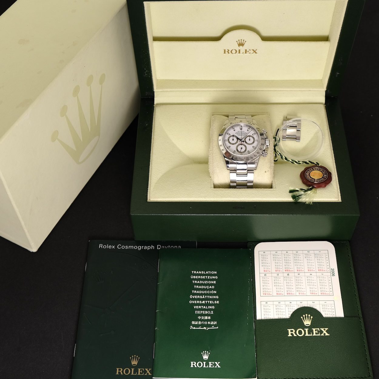 Rolex Daytona 116520 fra 2004. Kommer med bokse og manualer, men uden orig. certifikat. Fremstår i pæn stand med alm. små brugsspor. Modellen der kørte fra 2000-2016 med det robuste værk cal. 4130, som også findes i efterfølgeren 116500LN. Er man på jagt efter et flot og billigt stål Daytona er dette et rigtig godt bud på ure, som giver adgang til Rolex mest prestigefyldte model.