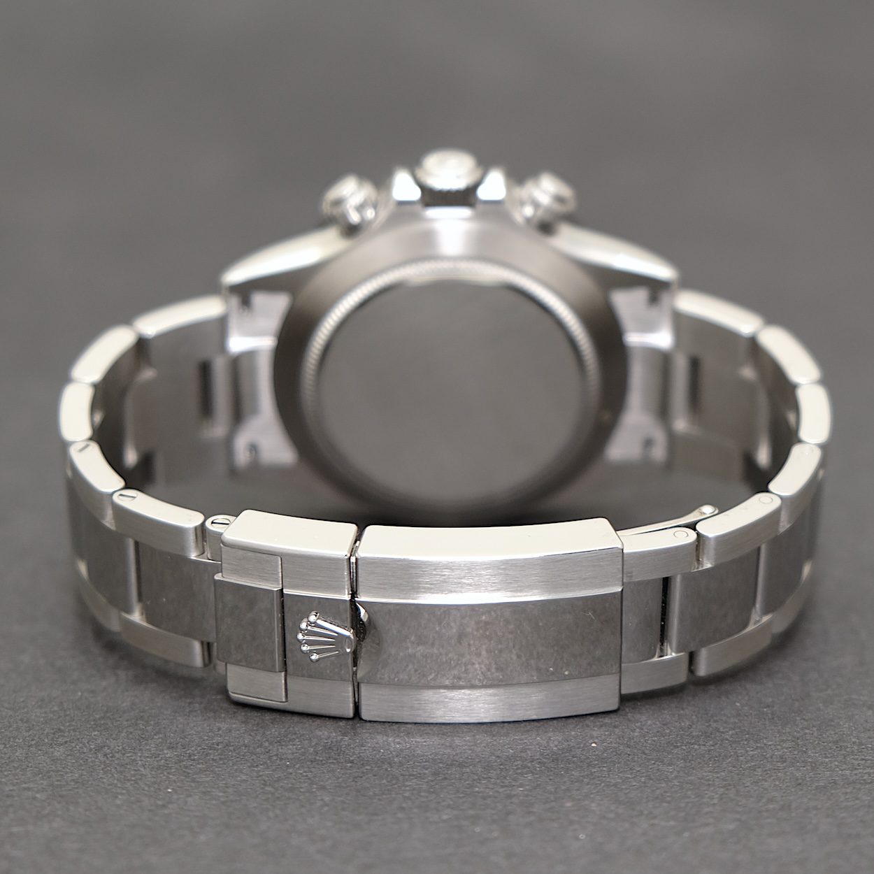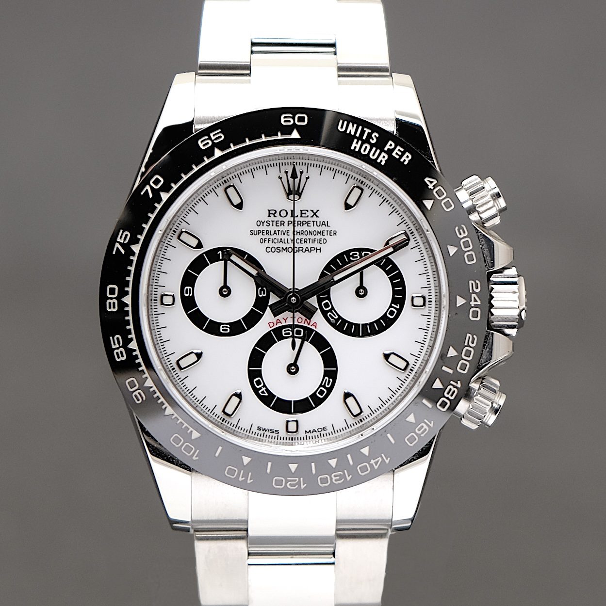 Rolex Daytona “Panda” 116500LN med bokse og Klarlund papirer fra 2020. Desuden original kvittering. Fremstår nyt og ubrugt uden brugsspor. Kun været på armen ved tilpasning under købet. Det nu udgåede Daytona med hvid skive, med lidt kraftigere sorte sub-dials end den aktuelle model. Et af de mest eftertragtede Rolex modeller, som fortsat handles til langt over listepris.