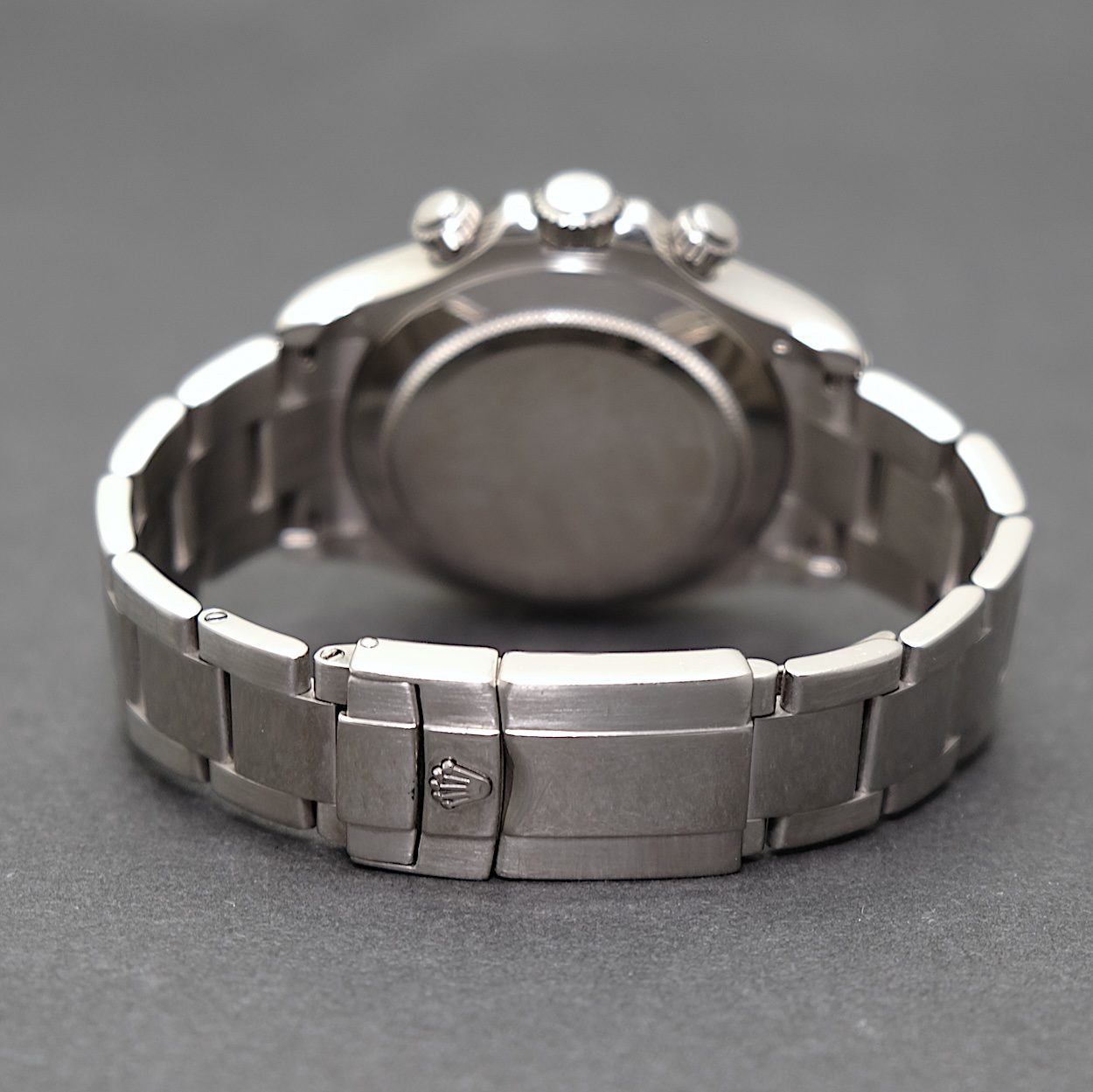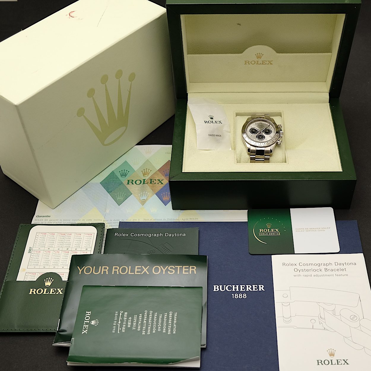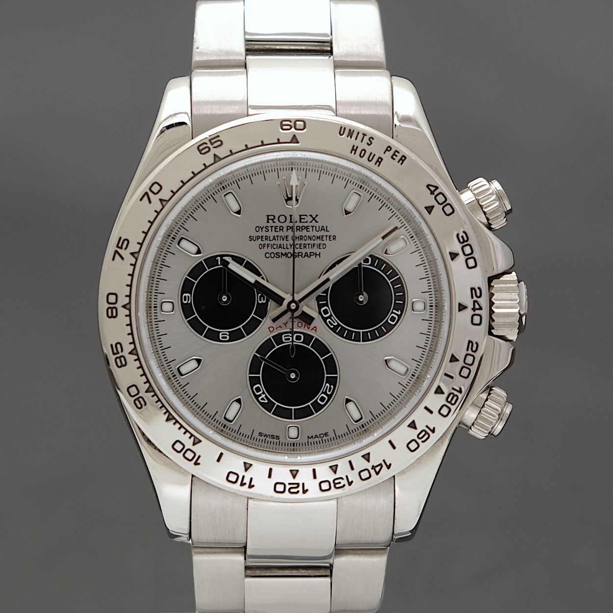Rolex Daytona 116509 med bokse og papirer fra 2006. Netop gennemgået fuld service hos Rolex i 2025. Servicepapirer fra Bucherer medfølger. Fremstår i fin stand uden ridser/hak. Lænken er i fin stand uden stræk. Den eftertragtede udgave med grå Ghost skive. Modellen er i fuld 18 k hvidguld, som tilfører uret den helt rette eksklusivitet. Kendere ved at Ghost skiven kun findes i guld-udgaven, så dermed er det et ur, der i den grad udsender signal om diskret luksus.