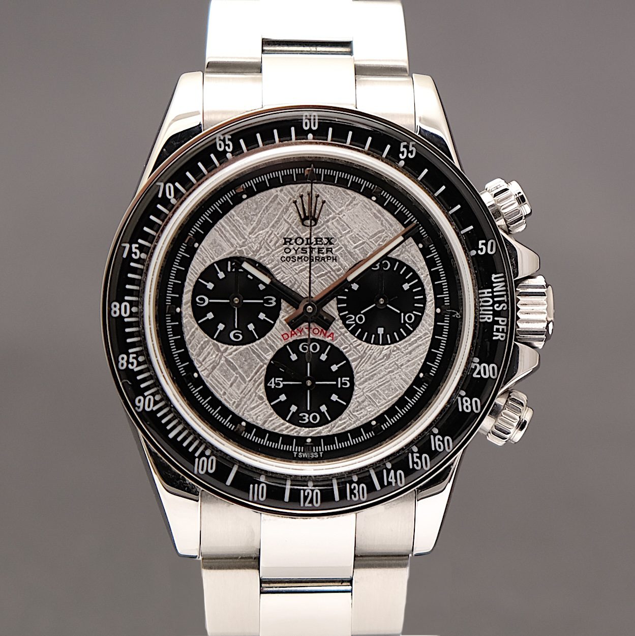 Rolex Daytona 116520 fra 2008. Kommer uden tilbehør. Fremstår i flot stand med små brugsspor. Uret er modificeret med en speciallavet meteorit skive og bakelit lynette fra DiW. Skiven i meteorit (samme sten som Rolex bruger) tager afsæt i det legendariske Paul Newman ref. 6263 skive layout. Ligeledes er lynetten baseret på 6263 designet i bakelit. Dermed er der tale om et unikt moderne Daytona med vintage designelementer, som kun findes i dette ene eksemplar. Den oprindelige sorte skive samt lynette medfølger. Man får dermed et Daytona som ingen andre og tilmed med meteorit skive som er tæt på umulig at opdrive via AD.
