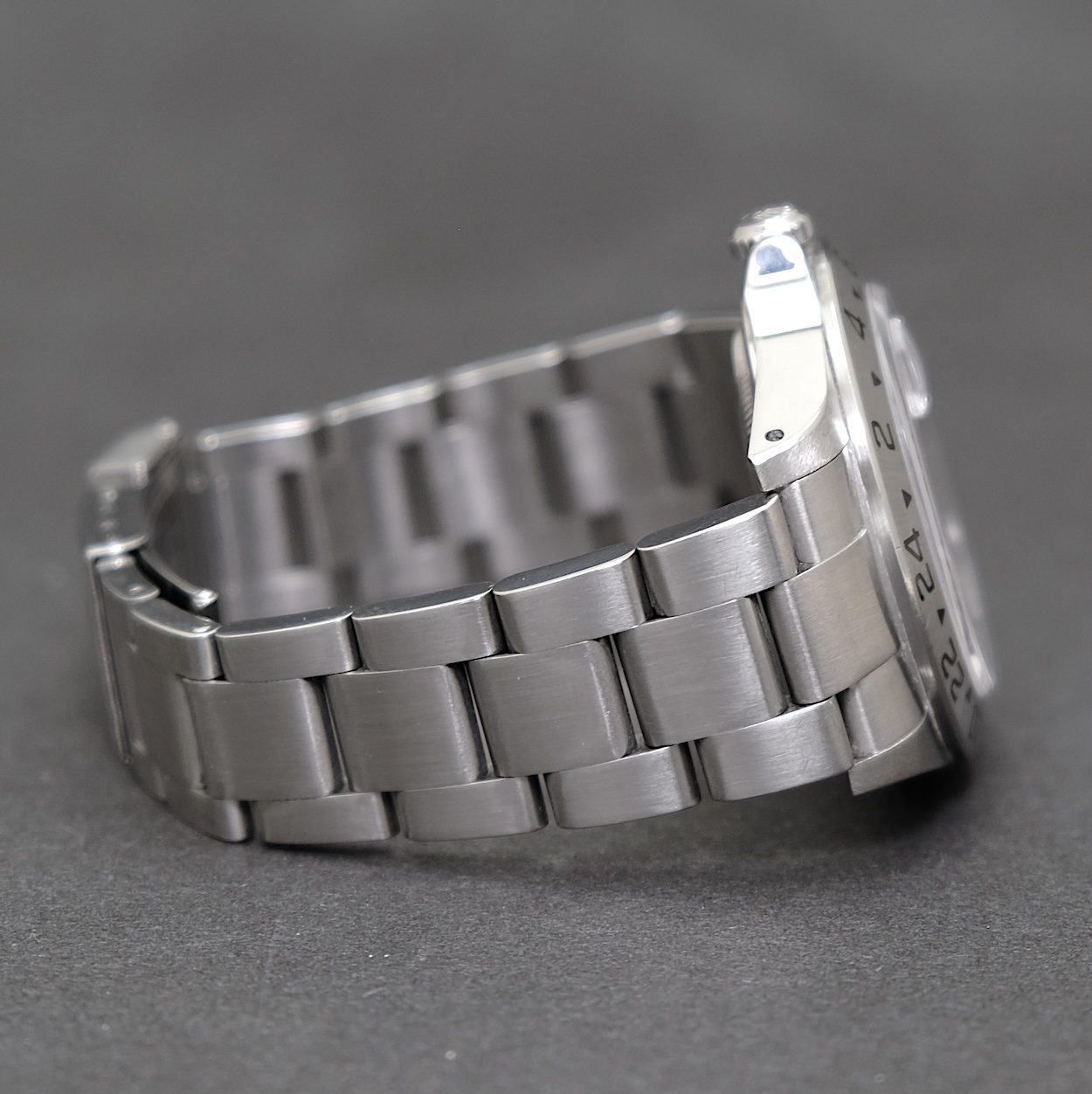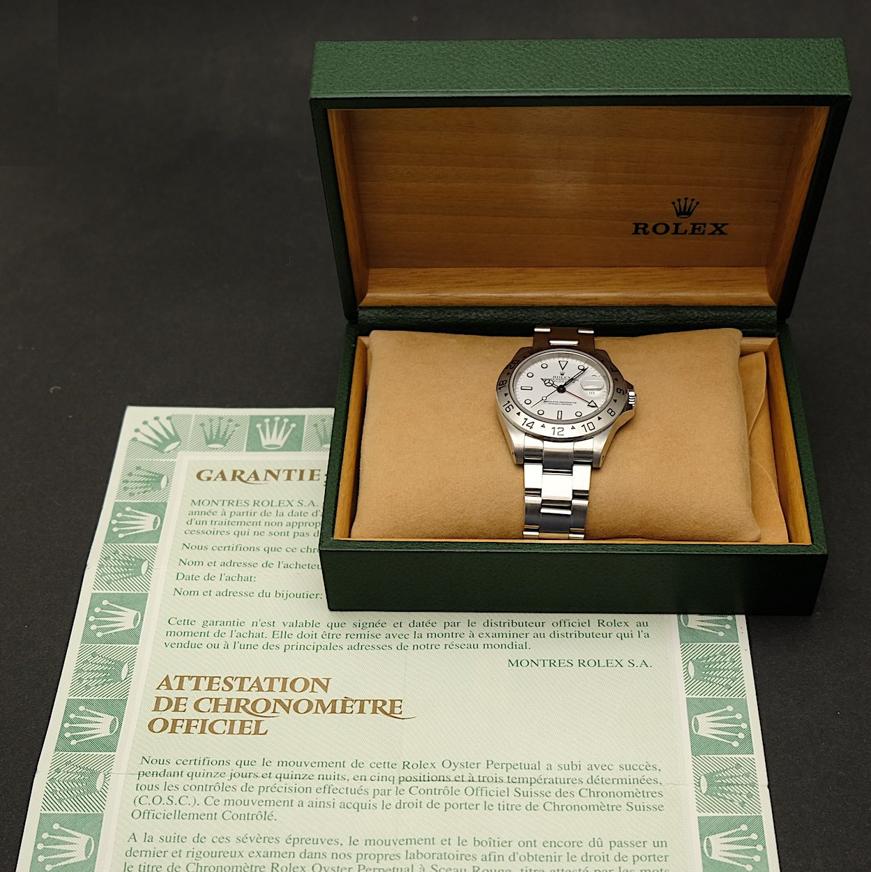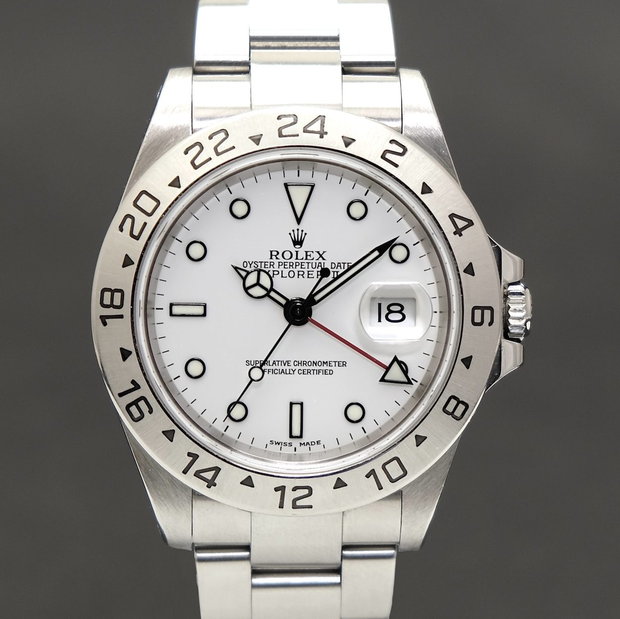 Rolex Explorer II 16570 med bokse og papirer fra 2001. Uret fremstår i flot stand med symmetrisk skarp kassen, som kun er belevet ganske let poleret gennem tiden. Lænken er i tilsvarende fin stand uden stræk. Et ur der giver super value for money, og lidt atypisk pga den hvide skive som kun er forbeholdt Explorer og Daytona af sportsmodellerne.