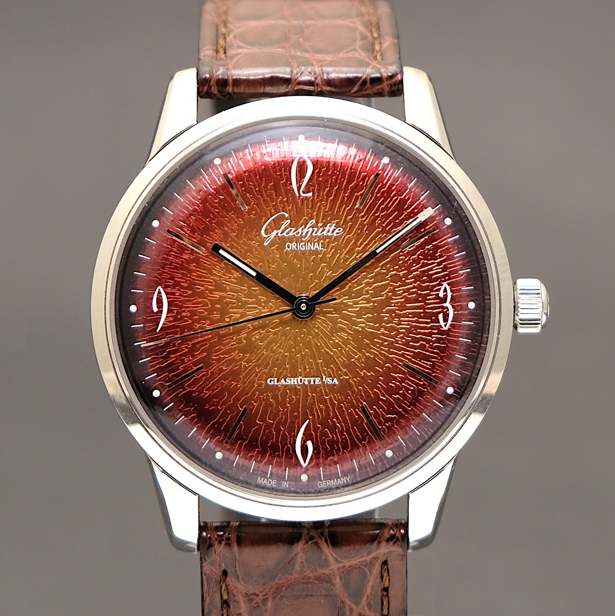 Glashütte Original Sixties Automatic ref 1-39-52-13-02-04 med bokse og danske papirer fra 2020. Fremstår uden nævneværdige brugsspor. Smukt klassisk ur i stål med 39 mm kasse. Unik rød/orange-nistret skive, som er vild pga. farvespillet, der udsendes afhængigt af lysindfald og styrke. Modellen er lavet i stærkt begrænset periode med denne skive. Glashütte Original hører til blandt toppen af tysk urmageri, og i en finish der sjældent ses på samme niveau til bare tilnærmelsesvis samme budget fra Schweiz. Her er virkelig tale om høj value-for-money. Modellen her er udstyret med automatik, hvor rotoren har 18k guld-lod, dobbelt svanehals-regulering og håndgraveret balancebro.