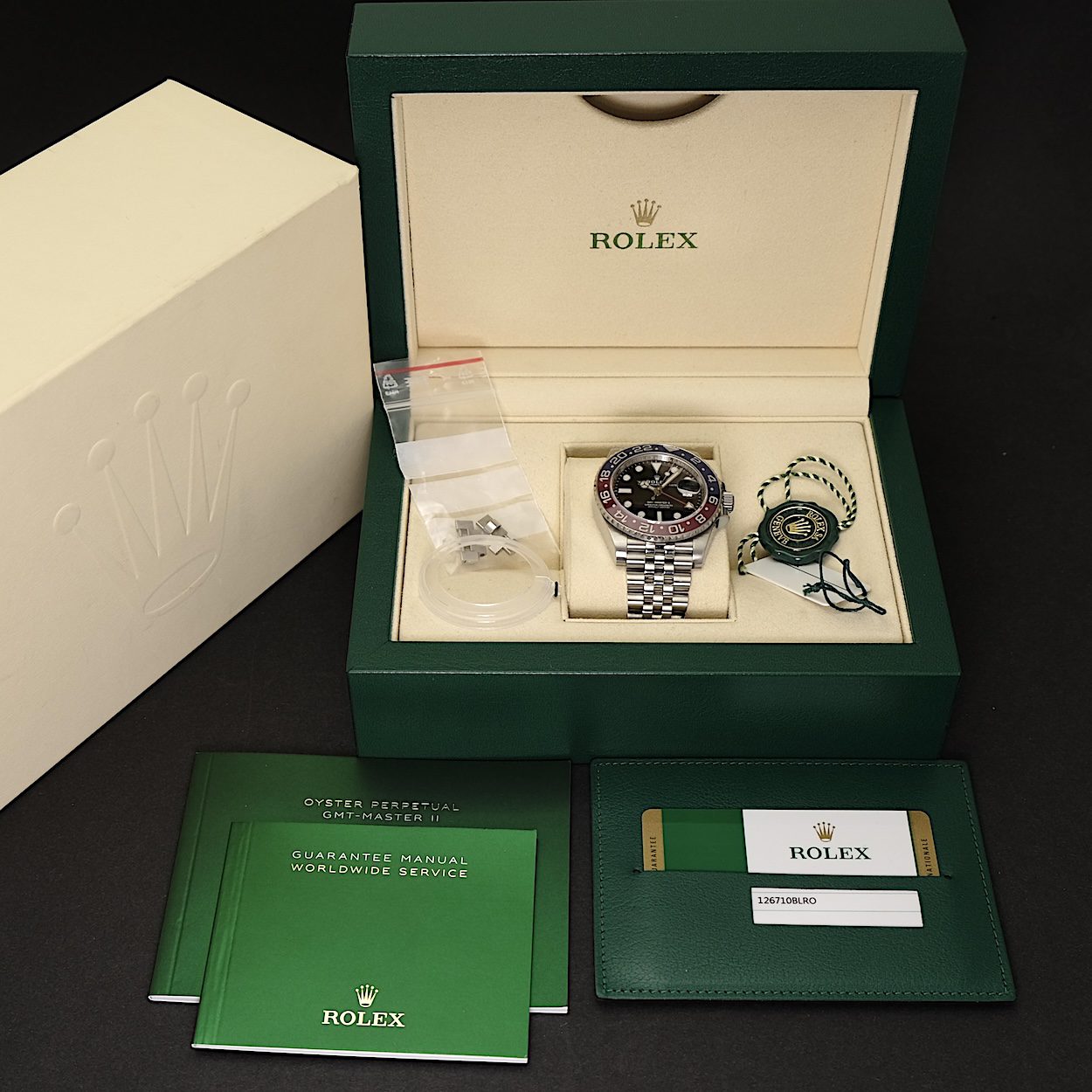 Rolex GMT-Master II 126710BLRO med bokse og papirer fra 2018. Fremstår med få og små brugsspor i form af hairlines. Den aktuelle Pepsi model som er umulig at skaffe via AD. Her modellen på Jubilee lænke, som er mere efterspurgt end udgaven på Oyster.