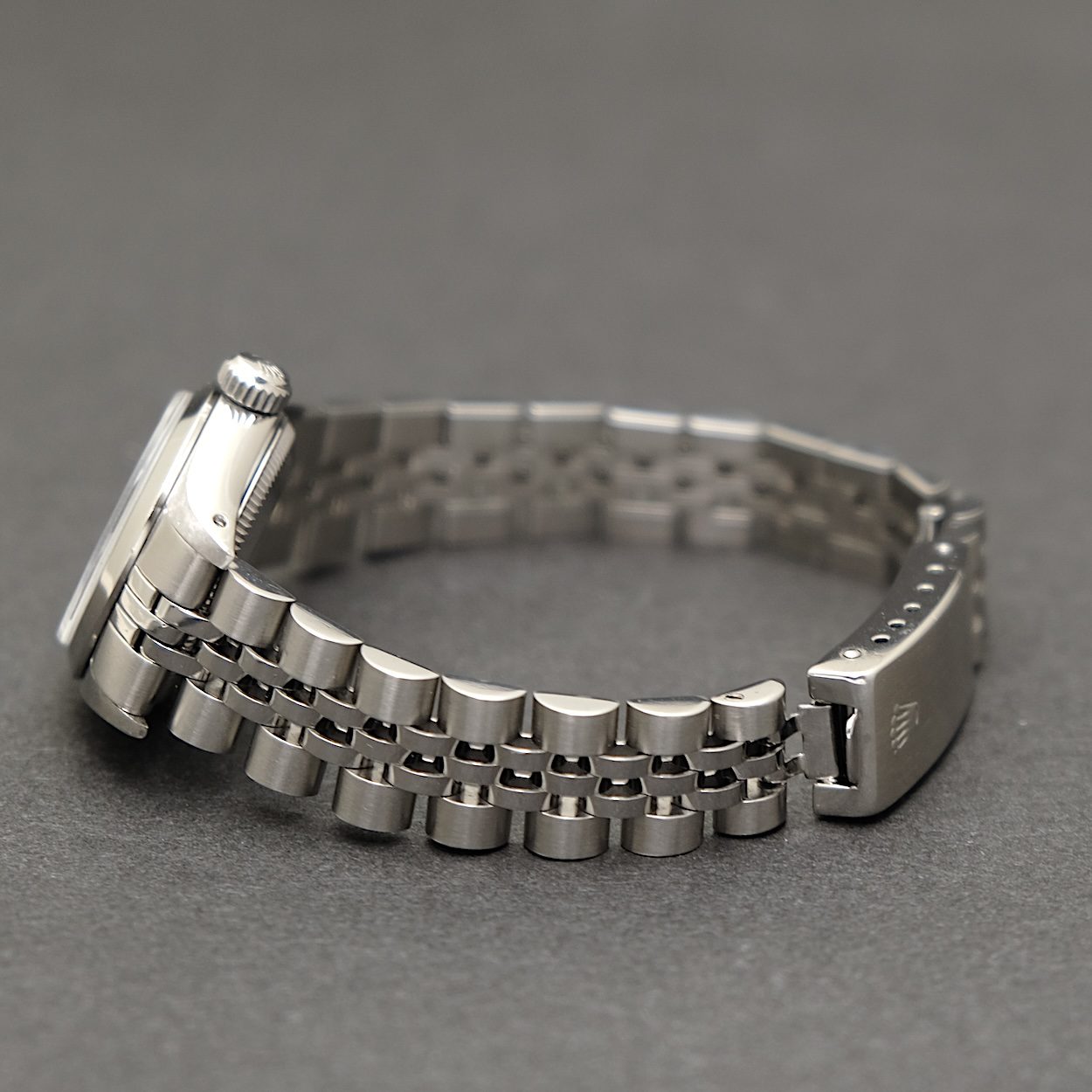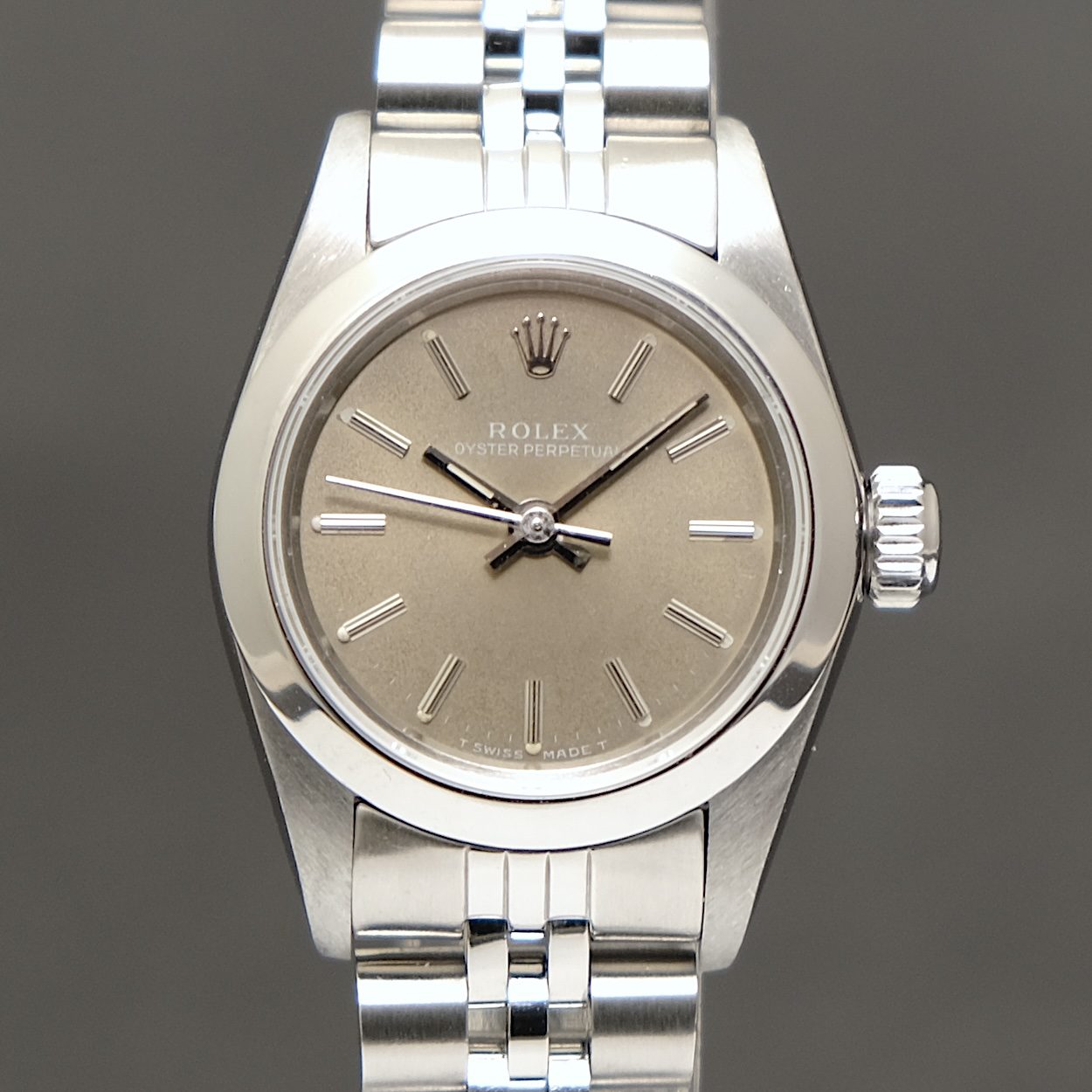 Rolex Oyster Perpetual ref 69160 fra 1990. Det klassiske dame Oyster Perpetual i 26 mm, som her kommer med safirglas, smuk patineret grå skive og på Jubilee lænke. Fremstår i flot stand uden større brugsspor. Værket er med automatik og quick set dato.