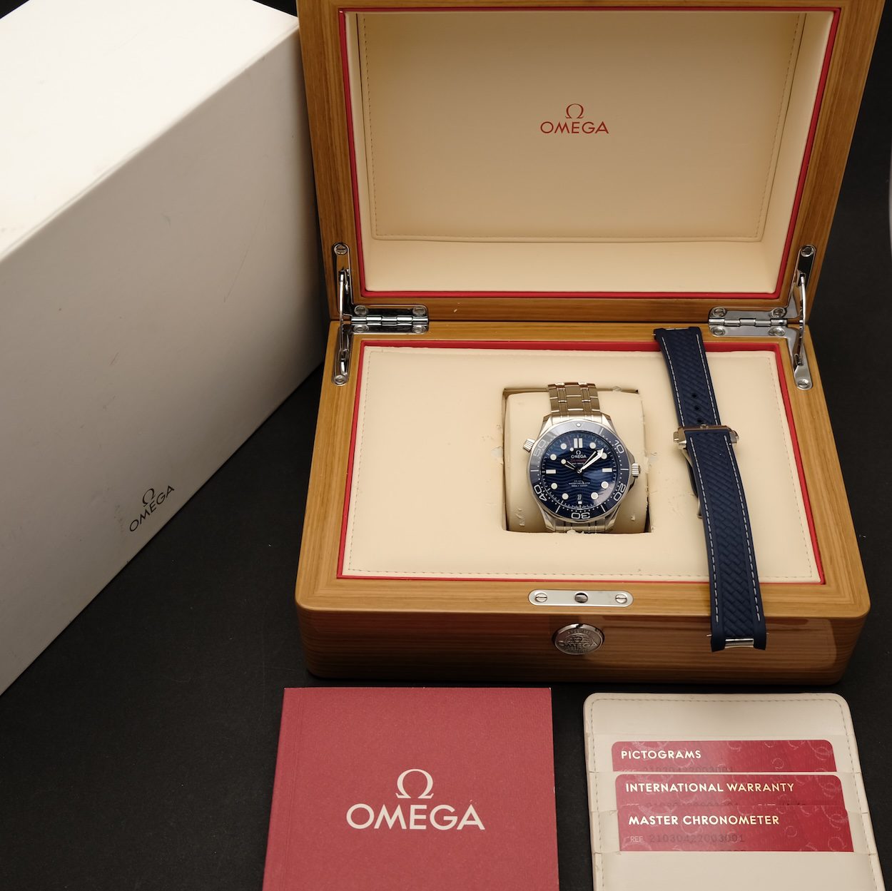 Omega Seamaster 300m Diver ref 210.30.42.20.03.001 med bokse og danske papirer (K. Pedersen) fra 2020. Fremstår i flot stand med små alm. brugsspor i form af hairlines. Foruden lænken kommer uret med en original Omega gummirem med tilhørende foldespænde. Det aktuelle Seamaster 300 i den blå udgave med in-house cal. 8800 værk og ceramic lynette. Vejl. nypris er 50.600 DKK og yderligere 4.700 DKK for gummirem/spænde.