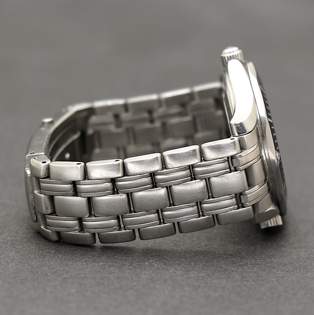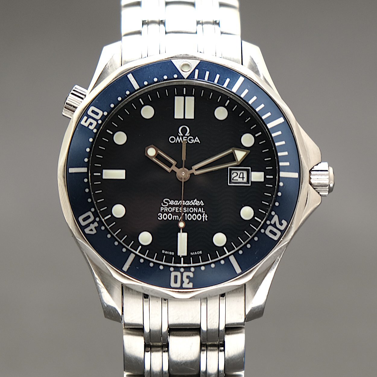 Omega Seamaster 300m Diver ref 25418000 fra 1999. Kommer uden tilbehør. Fremstår i pæn stand med alm. aldersrelaterede brugsspor. Fullsize modellen i 41 mm med quartzværk. Netop denne reference er Omegas første James Bond ur, som blev brugt af Pierce Brosnan i filmen GoldenEye (1995). Et identisk blå Seamaster 300M blev også brugt i de efterfølgende tre 007-film med Brosnan, men dog i en mekanisk udgave.