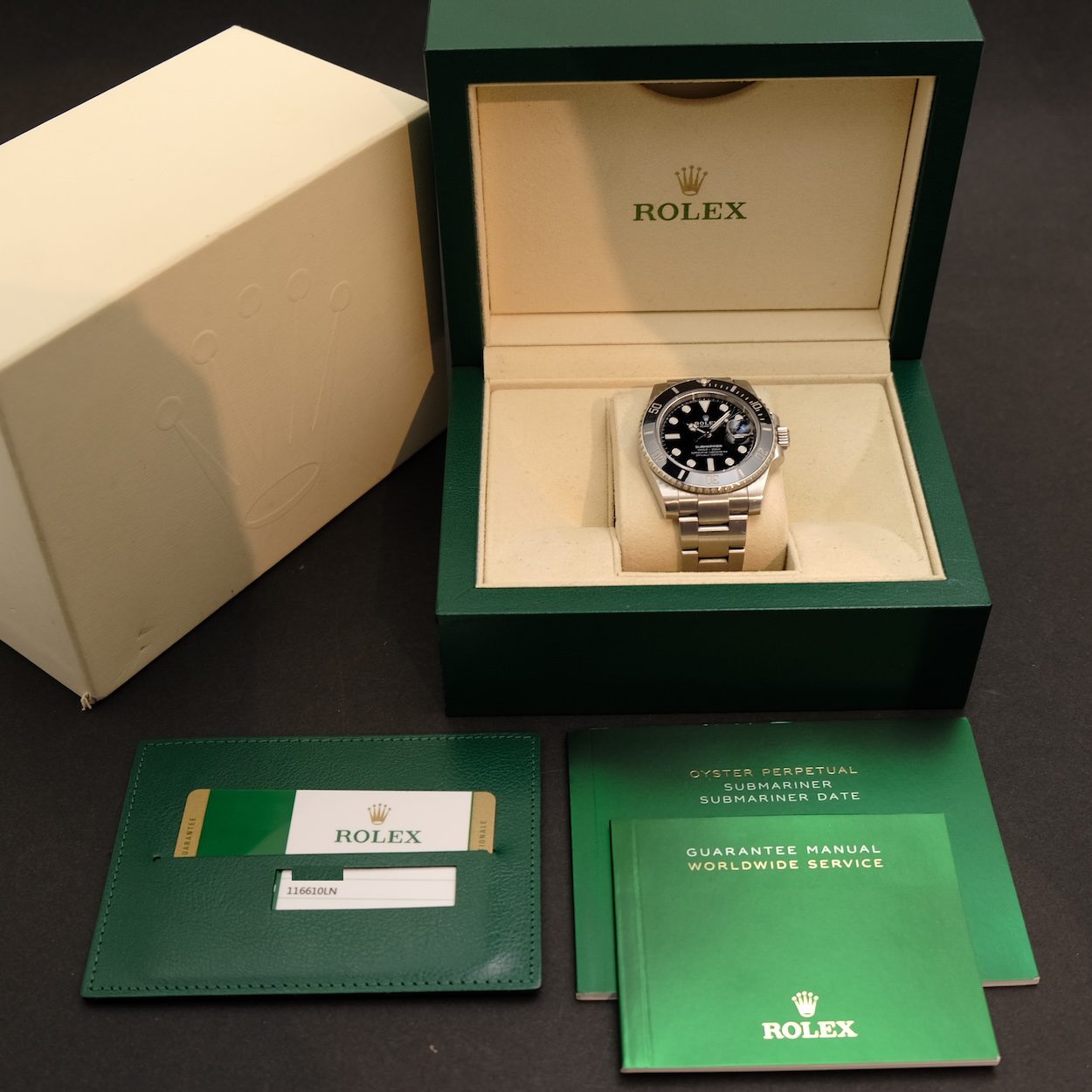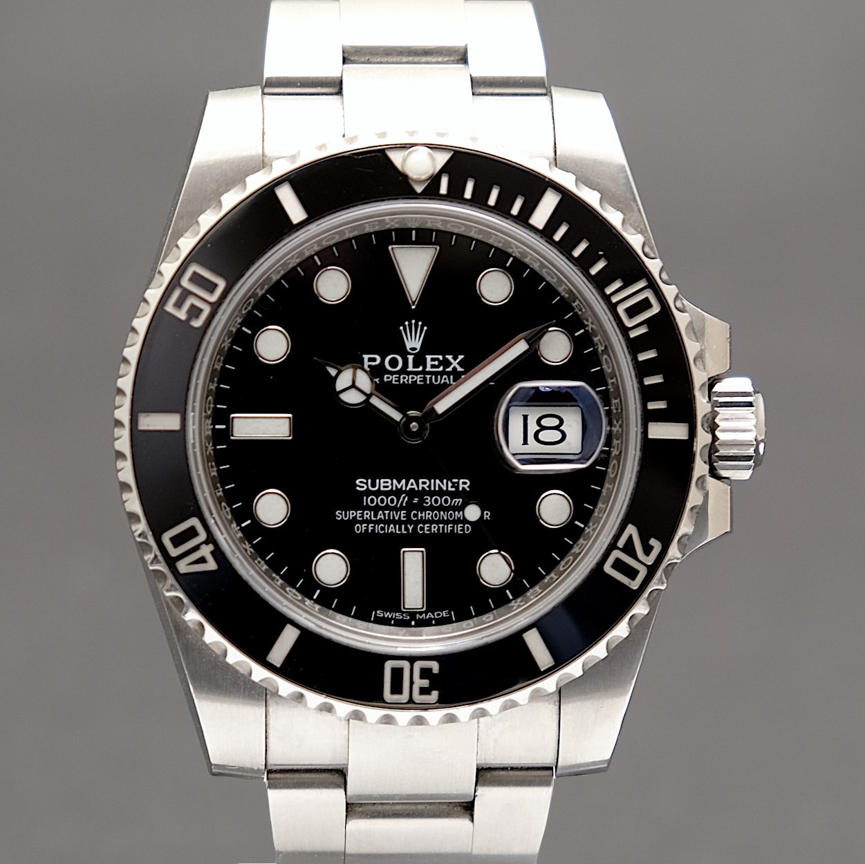 Rolex Submariner 116610LN med bokse og papirer fra 2018. Fremstår i fin stand uden større brugsspor. Den nu udgåede udgave i 40 mm med Maxi-kasse som mange foretrækker frem for den aktuelle pga. det kraftigere kasse design.